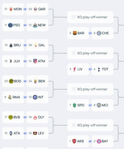 北京时间1月29日,欧冠联赛阶段结束了全部比赛的角逐。至此,欧冠淘汰赛的四大分区也正式落位完成。被本菲卡踢进附加赛的皇马将与曼城同区,巴萨、切尔西则将与大巴黎同区。